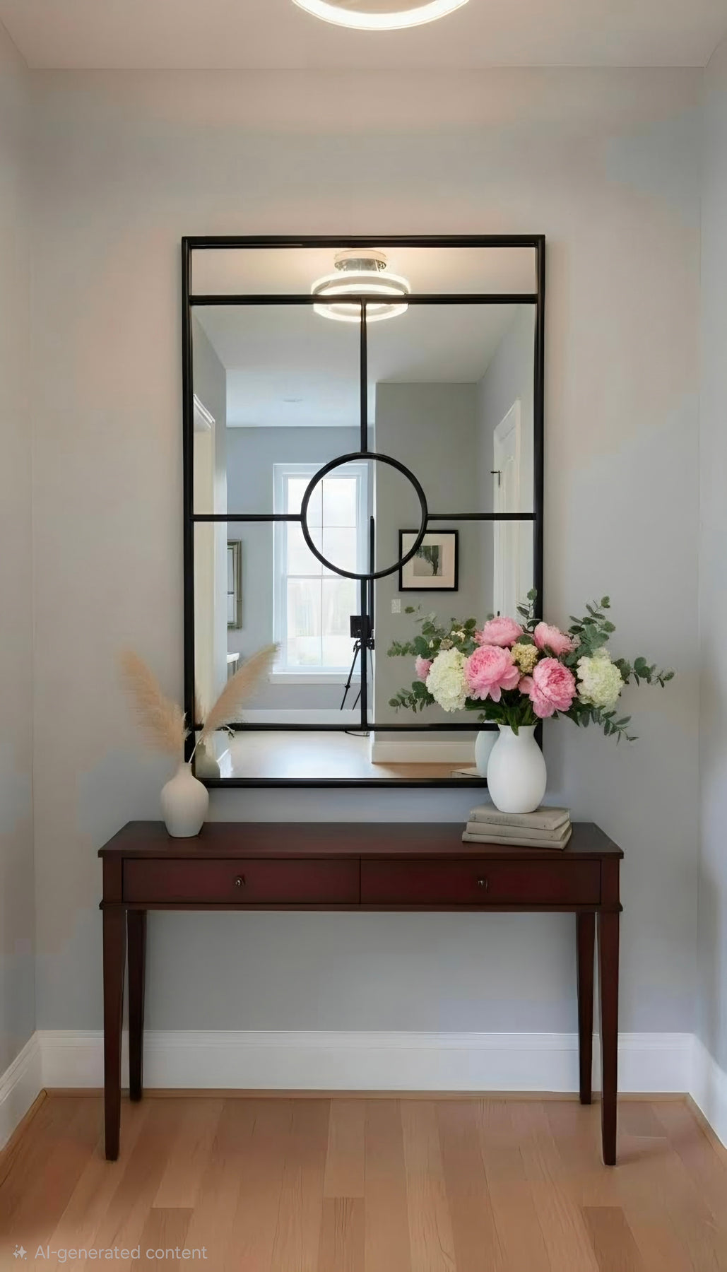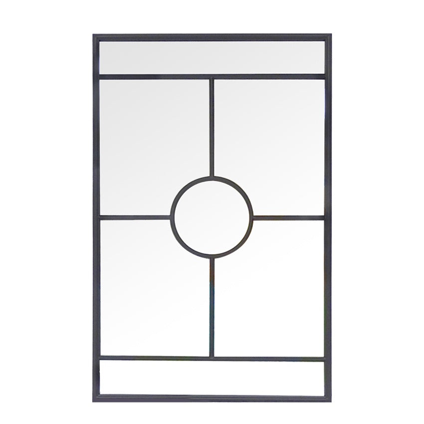 Art deco inspired mirror with a black metal frame. Suitable for bedrooms, living spaces, and bathrooms.