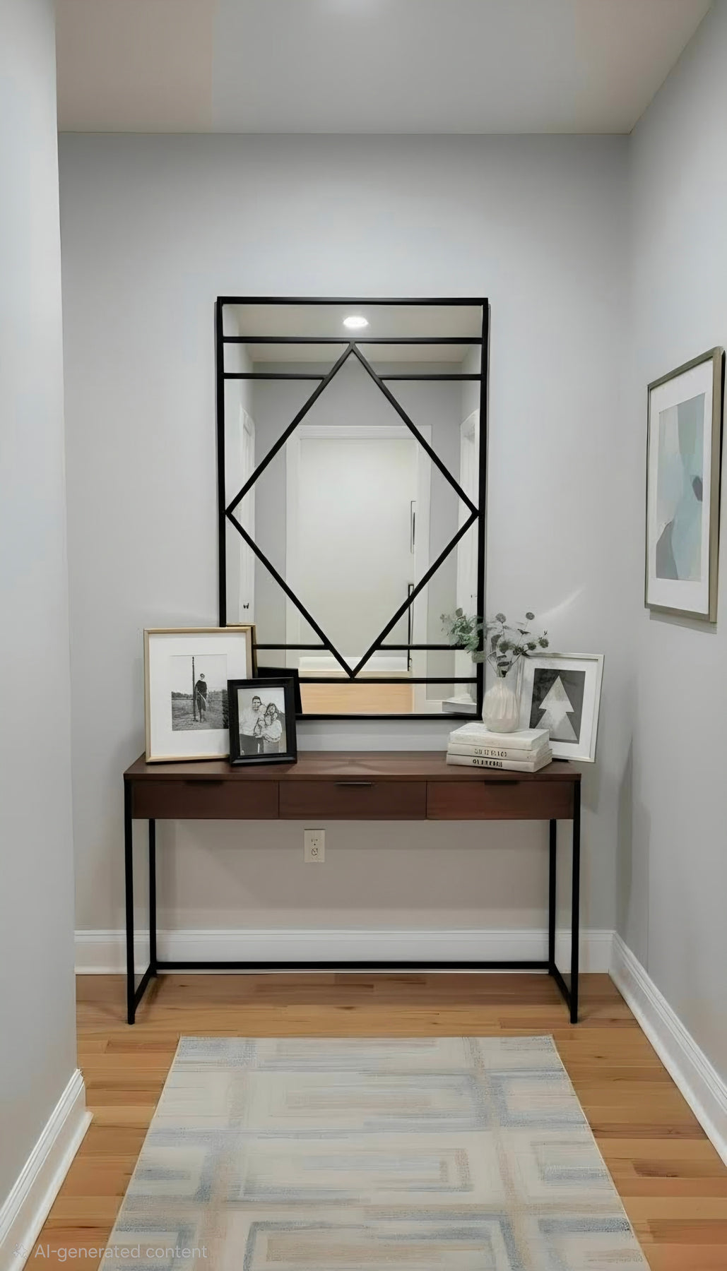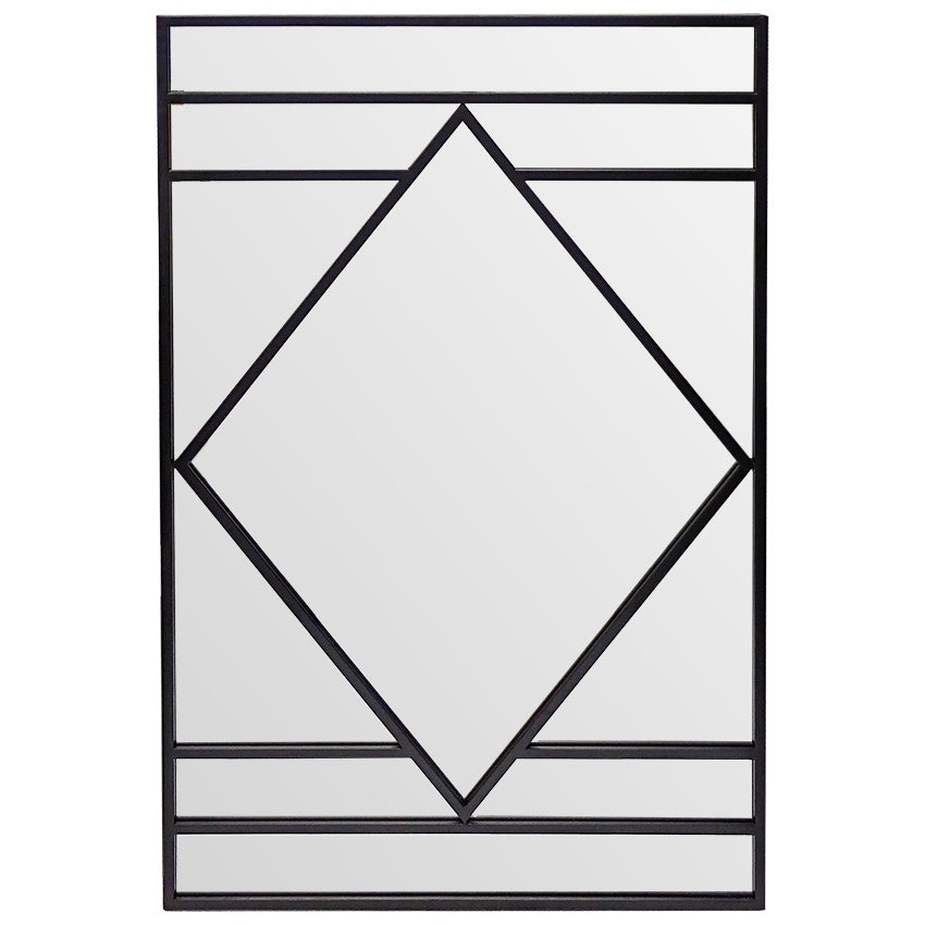Art deco inspired mirror with geometric matt black frame. Suitable for bedrooms, living spaces, and bathrooms.