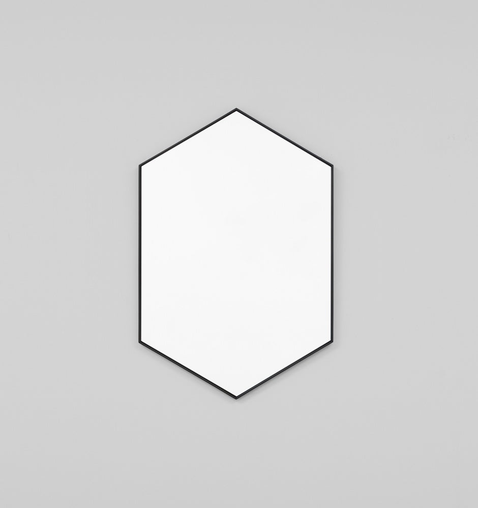 This mirror features a distinctive hexagon geometric shape balanced by a refined and minimal frame profile. The mirror can be hung vertically or horizontally making it a versatile addition to a diverse range of spaces.