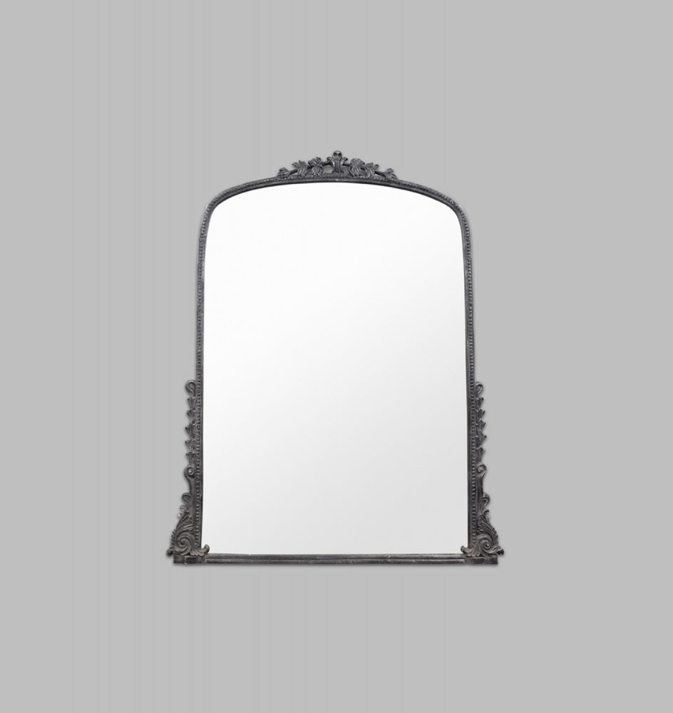 A traditional Art Nouveau overmantle style arched mirror featuring a charcoal black metal ornate frame.