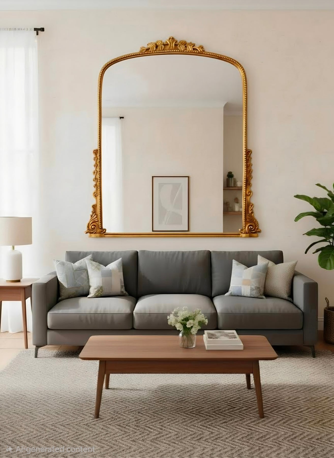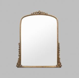 A traditional Art Nouveau overmantle style arched mirror featuring a gold metal ornate frame.